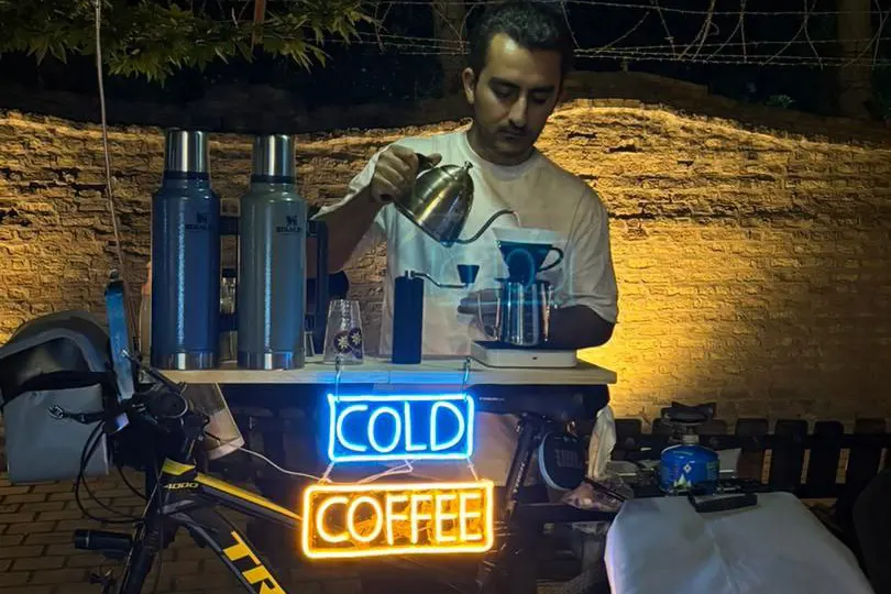 تصمیم جدی شد. در اردیبهشت ماه ۱۴۰۴، آستینها را بالا زدم. وسایل لازم را تهیه کردم، میزی خلاقانه روی دوچرخهام ساختم و یک تابلوی LED نئونی زیبا برای آن طراحی کردم. برای شروع، نوشیدنی قهوه سرد دم (Cold Brew) را انتخاب کردم؛ نوشیدنیای که هم آمادهسازی آن برای یک کافه سیار مناسب بود و هم در فصول گرم سال طرفداران زیادی داشت.